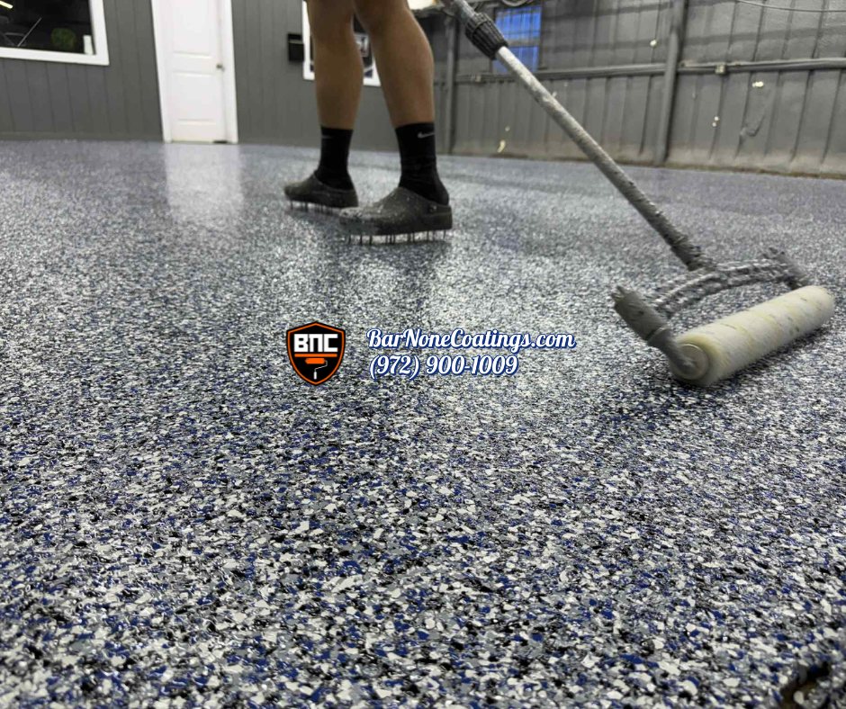 Application of our industrial-grade epoxy base coat, followed by a full broadcast of functional flake for texture and durability.